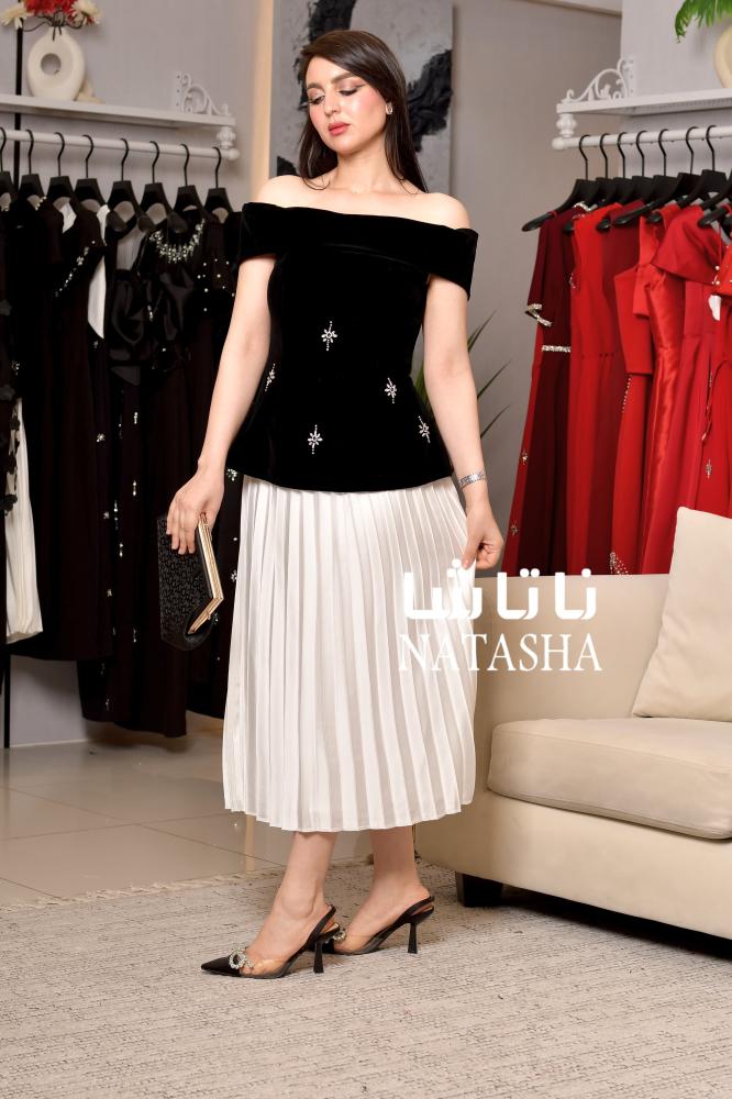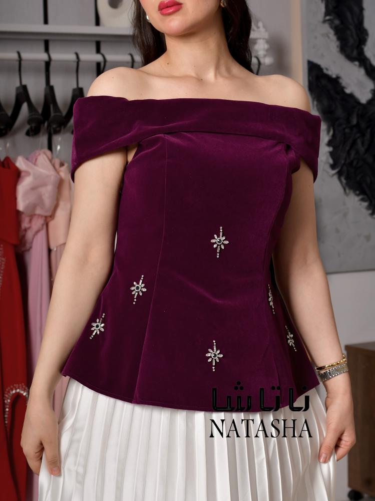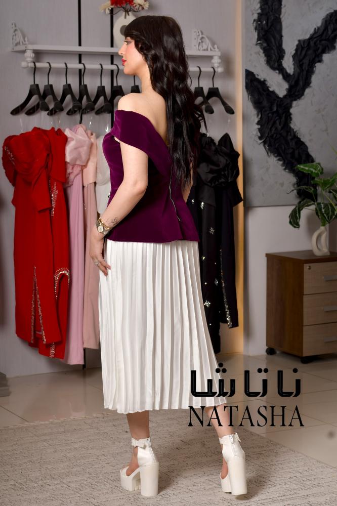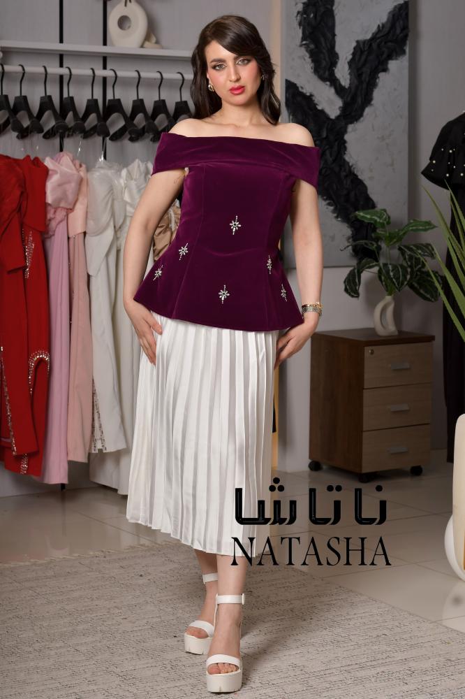 فستان اوف شولدر بلون برغندي وكسرات تنورة بشكل انيق
